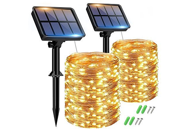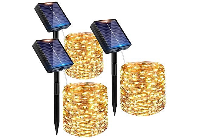 Presenta tres cadenas solares de 12 metros con 360 LED blanco cálido, fabricadas en cobre flexible y plástico ABS resistente. Ofrece ocho modos de iluminación, función de memoria y protección IP65, lo que asegura durabilidad frente a la intemperie. Su sistema de carga solar y doble instalación permite una iluminación exterior eficiente y versátil durante largas horas cada noche.