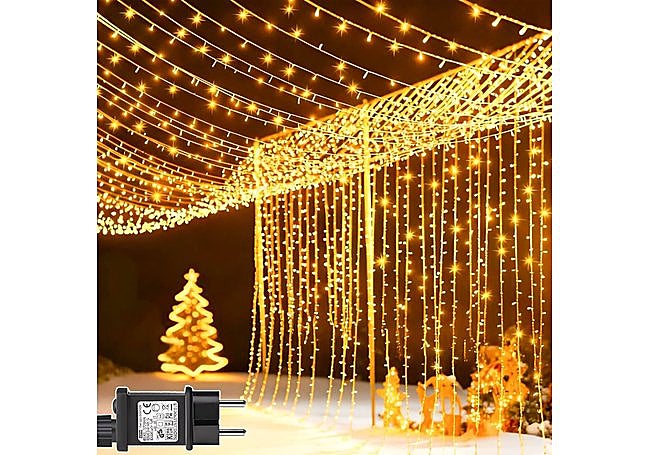 Con una estructura de cortina de 600 LED distribuidos en 24 cadenas, esta iluminación de Navidad cubre 6x3 metros y permite seleccionar entre 8 modos de luz distintos. Su resistencia IP65 garantiza funcionamiento en exteriores, mientras la función de memoria y temporizador facilita el control. Bajo voltaje y posibilidad de conexión en serie completan sus características destacadas.