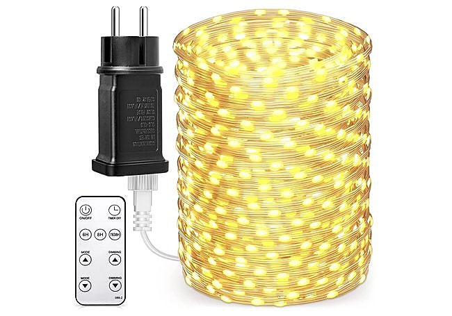 La guirnalda BESCOST mide 50 metros e incluye 500 LEDs, proporcionando una iluminación blanca cálida con ocho modos y cuatro niveles de brillo ajustables. Cuenta con resistencia al agua IP65 y una función de temporizador para uso prolongado en exteriores, mientras que un control remoto permite un fácil ajuste de las opciones de iluminación.