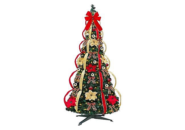 Con estructura plegable y decoración completa, este árbol de Navidad artificial incorpora luces integradas, cintas y lazos en tonos tradicionales. El material de PVC aporta resistencia y mantiene el aspecto festivo año tras año. Su montaje es rápido y reutilizable, adecuado para espacios interiores o exteriores.