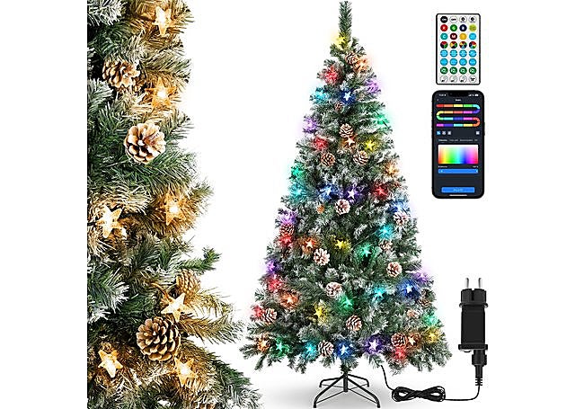 Con efecto de nieve y 180 cm de altura, este árbol de Navidad artificial Aigostar incorpora 66 luces LED inteligentes con hasta 39 modos y sincronización musical. Sus 650 ramas y 43 piñas naturales crean un aspecto invernal realista. El sistema de control por app y mando permite personalizar colores y efectos, aportando versatilidad y ambiente festivo.