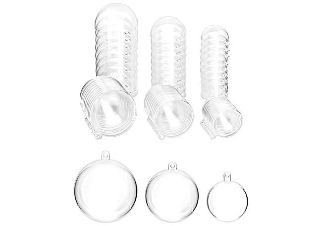 Set de 20 bolas de Navidad de acrílico transparente de 8 cm. Estas bolas se abren fácilmente para permitir la personalización con rellenos. Su diseño ligero facilita colgarlas en cualquier lugar, y el material acrílico duradero asegura su uso durante varios años. Tienen un acabado liso que permite crear adornos personalizables.