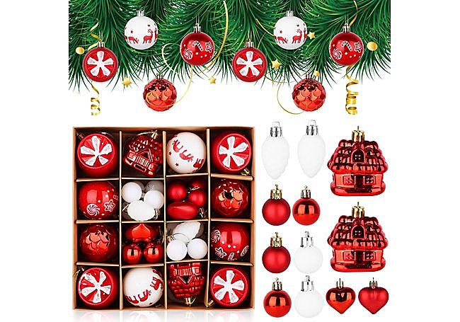 Presenta una selección de bolas navideñas en tonos rojo, verde y blanco, fabricadas en plástico resistente y decoradas con purpurina y acabados brillantes. El set de 42 piezas incluye ganchos desmontables para colgar fácilmente y aporta un estilo tradicional al árbol de Navidad. Su diseño inastillable garantiza durabilidad y mantiene los colores vivos temporada tras temporada.