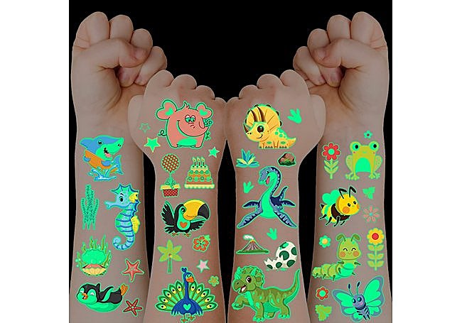Con más de 400 tatuajes temporales en 30 hojas, este set de Jewan transforma cualquier fiesta infantil en un evento lleno de color y brillo. Los diseños variados, que incluyen animales, dinosaurios y motivos marinos, captan la atención de los niños y destacan por su efecto luminoso en la oscuridad.