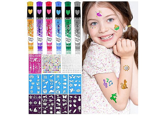 Con seis rotuladores de purpurina, nueve plantillas y más de 300 diamantes adhesivos, este set de AIRNOGO transforma cualquier fiesta en un taller creativo. Los niños pueden dibujar, colorear y personalizar tatuajes temporales en la piel de forma sencilla y segura, gracias a la tinta vegetal y los materiales hipoalergénicos.