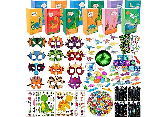 Diseñado pensando en las fiestas temáticas, el set de Slmeno reúne 204 piezas inspiradas en dinosaurios, desde figuras que crecen en agua hasta máscaras y pulseras. Todo viene organizado en bolsitas individuales, facilitando la preparación y el reparto durante cumpleaños o eventos escolares.