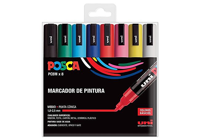 ¿Buscas una herramienta para despertar tu creatividad? El set UNI Posca PC 5M Basic incluye ocho rotuladores de pintura al agua con acabado mate y gran opacidad, ideales para transformar cualquier superficie en un lienzo personal. Su tinta acrílica, rica en pigmentos, ofrece colores intensos, duraderos y sin olor, perfectos para manualidades, decoración o ilustración.