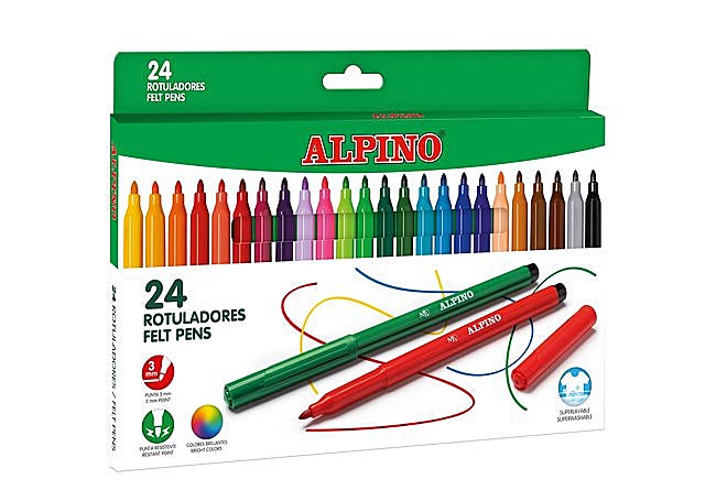 Con su irresistible gama de colores vivos, el set de rotuladores Alpino transforma cada dibujo en una aventura creativa. La punta resistente de 3 mm facilita el trazo tanto en manos pequeñas como en adultos, permitiendo colorear con soltura y precisión en cualquier tipo de papel.