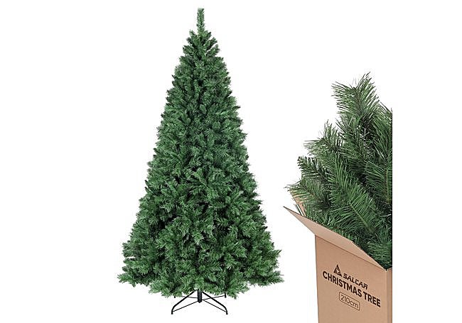Con estructura robusta en PVC ignífugo, el árbol artificial SALCAR de 210 cm destaca por sus 868 puntas de rama que ofrecen un aspecto voluminoso y natural. El montaje rápido en tres secciones y el soporte metálico facilitan su uso y almacenaje. Su diseño resistente y reutilizable permite mantener una decoración navideña vistosa durante años.