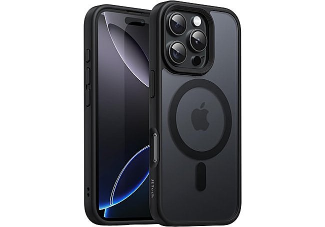 La funda JETech para iPhone 16 Pro Max tiene un diseño translúcido mate, un respaldo resistente a manchas, protección antigolpes, un marco de TPU flexible y una parte posterior de policarbonato. Es compatible con MagSafe y permite acceso completo a los botones y puertos del dispositivo.