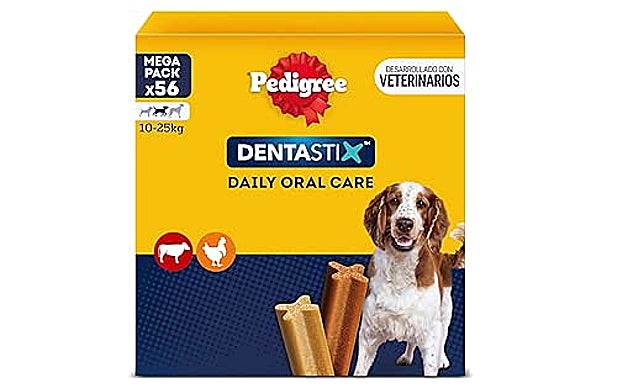 A tu perrete no le hace falta ir al dentista si te animas a darle un premio como éste. Se limpiarán bien los dientes y encías masticando una de estas barritas de la conocida marca que, además de gustarles, proporciona una limpieza total. ¡Y además, mejora el aliento perruno! Su precio es de 15,02€ por el pack de 56 unidades.