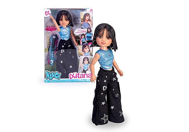 Inspirada en la cantante Aitana, esta muñeca Nancy destaca por su melena corta con flequillo y detalles auténticos como el tatuaje Alpha. El conjunto exclusivo, con top azul brillante, pantalón negro con flecos y botas, incorpora accesorios como pendientes de aro y maquillaje de ojos azul, aportando un toque realista y actual al diseño.