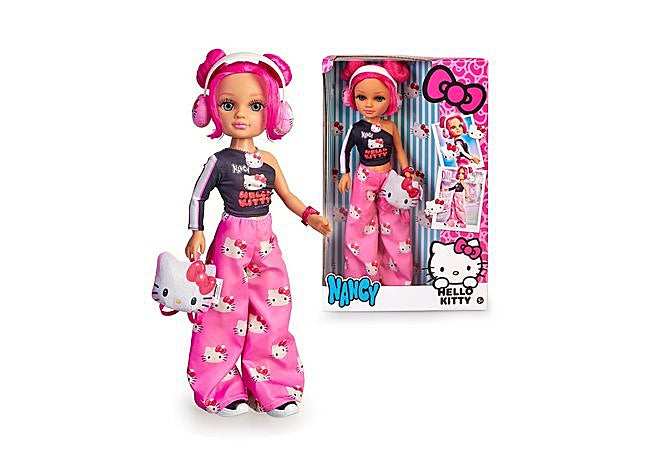 Con un estilo urbano y contemporáneo, esta muñeca Nancy Fashion Hello Kitty destaca por su melena rosa en moños altos y un conjunto moderno con camiseta negra y pantalones anchos. Incluye mochila y auriculares inalámbricos, fusionando moda y tecnología. Su diseño combina elementos actuales y detalles inspirados en Hello Kitty, aportando personalidad y atractivo visual al conjunto.