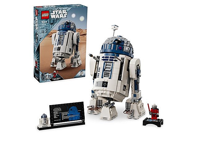 El set LEGO Star Wars R2-D2 permite ensamblar un modelo articulado de R2-D2 con detalles como una cabeza giratoria y herramientas integradas. Incluye una minifigura exclusiva de Darth Malak. La base conmemorativa del 25 aniversario es adecuada para exhibición, celebrando un legado icónico.