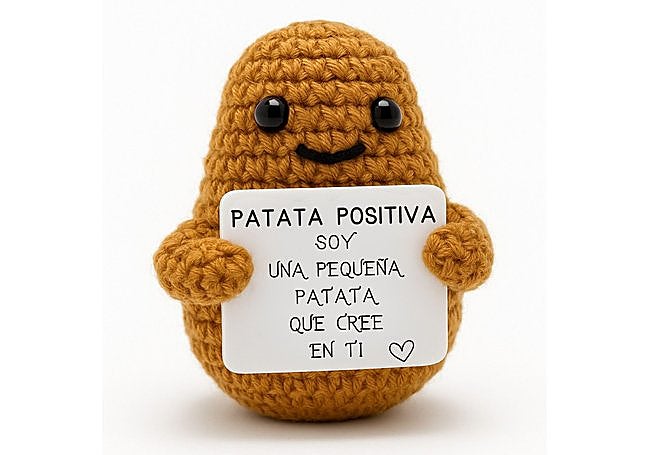 Confeccionado en lana de alta calidad, este peluche motivacional Patata Positiva destaca por su diseño artesanal y compacto. Su forma simpática y la palabra de ánimo impresa aportan un toque distintivo a cualquier espacio. La ligereza y el acabado resistente garantizan durabilidad, convirtiendo este artículo en una pieza decorativa original que transmite buen humor en el día a día.