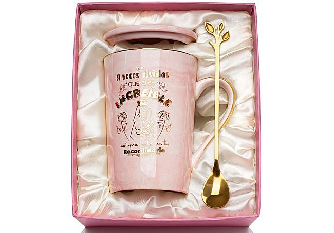Con acabado en mármol rosa y detalles dorados, esta taza de cerámica de 400 ml de YIKILYLIFE presenta impresión resistente al uso y viene acompañada de tapa, cuchara y tarjeta en una caja de regalo. Su fabricación a alta temperatura garantiza durabilidad, mientras que la compatibilidad con microondas y lavavajillas facilita el mantenimiento diario.