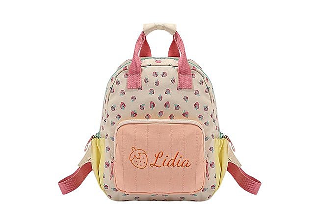 Esta mini mochila infantil de Genérico presenta un estampado de fresas y un bordado personalizado. El tejido es suave y resistente, las cremalleras permiten un deslizamiento fácil y cuenta con un bolsillo delantero para mayor funcionalidad. Sus dimensiones compactas (23 x 28 cm) proporcionan manejabilidad y ligereza.