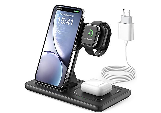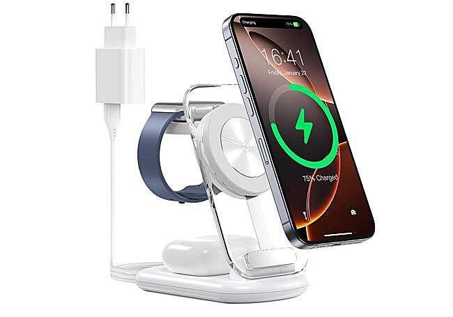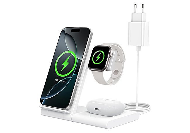 La estación de carga inalámbrica 3 en 1 de WATOE permite recargar iPhone, Apple Watch y AirPods juntos, sin enredos de cables. Su diseño plegable y ligero se adapta tanto al escritorio como a la mesilla de noche, y es fácil de llevar en viajes. Ofrece carga rápida y estable, con protección inteligente contra sobrecalentamientos y sobrecargas para mayor seguridad.