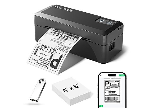 Con un diseño compacto y ligero, la impresora térmica Bluetooth 4x6 de ByteCintia facilita imprimir etiquetas de envío y organización desde cualquier dispositivo. Su doble conectividad Bluetooth y USB permite trabajar sin cables o desde el ordenador, adaptándose a iOS, Android y Windows. El formato portátil y la impresión a 203 dpi ofrecen resultados nítidos en segundos.