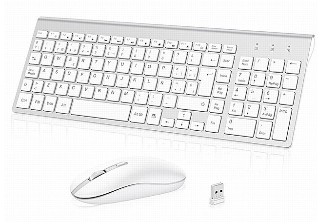 El combo de teclado y ratón inalámbrico de Cimetech ofrece una experiencia de uso impecable con su diseño ultrafino y elegante en blanco y plata. El teclado de tamaño completo tiene 102 teclas y un perfil bajo para una escritura cómoda y silenciosa, ideal para entornos donde el ruido es una preocupación.