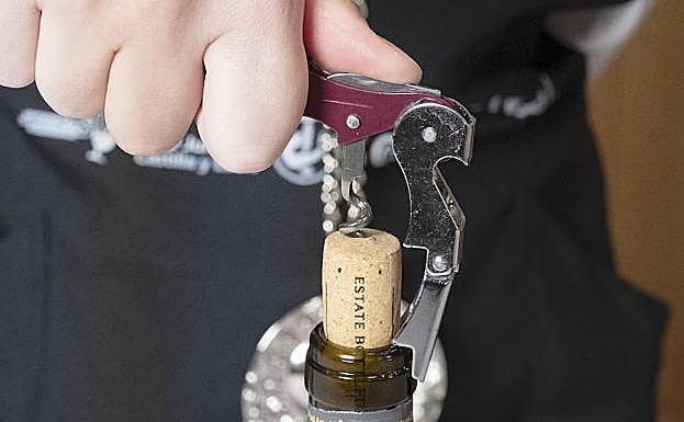 Uno de los sacacorchos más comunes es el de dos tiempos. Hay que girarlo hasta meter la espiral en el tapón, apoyar la otra pieza de metal en el borde y tirar. Cuando está casi fuera, se saca a mano el corcho para que no se parta.