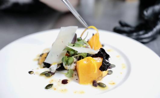 Proceso: Se cuece la calabaza troceada en agua durante quince minutos. Las setas se saltean en una sartén y para la vinagreta se reduce el vermú rojo hasta los 50 g y se le añaden 100 mml de aceite. Se emplata con una base de chutney de calabaza, los trozos de calabaza, las setas, el queso pecorino y feta, unas pipas de calabaza fritas y la vinagreta.