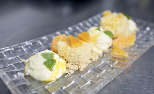 «En conjunto es un postre bastante fresco en el que hay un poco de fruta confitada, fruta fresca, bizcocho y espuma. En el restaurante ponemos helado de mandarina pero en casa podéis utilizar otro», apunta el chef.