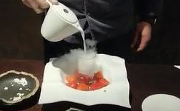 No le aporta ni sabor, ni color pero sí es una original forma de presentación recurrente en la alta cocina. El efecto humo que se ... consigue con el dióxido de carbono en estado sólido no deja de sorprender cuando se utiliza en gastronomía. El cocinero Rubén Escudero del restaurante que lleva su nombre, ha apostado por esta técnica para elaborar un delicioso postre de fresas. Para manipular el hielo seco es necesario utilizar unos guantes resistentes para evitar quemaduras. «Comprar este tipo de hielo para uso casero es más difícil pero me gustaría enseñaros como lo utilizamos para este plato», apunta el cocinero.