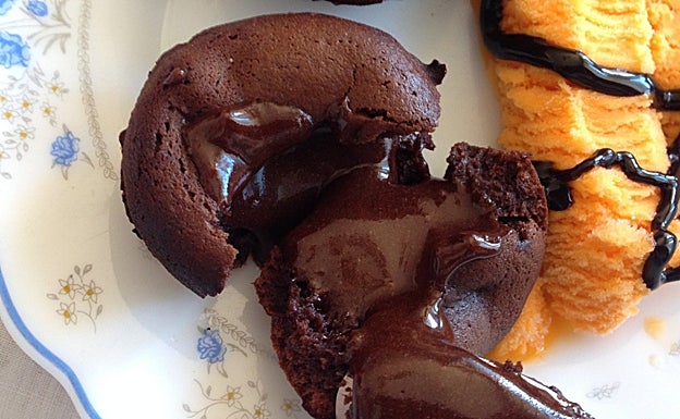 La mezcla espesa se echa en el molde con una bolita congelada de ganache y se cubre con la mezcla. Las bolitas se preparan hirviendo nata con trocitos de chocolate. Cuando este fría se hacen bolitas y se congelan. Para finalizar, se hornean durante doce y quince minutos a 180 grados.