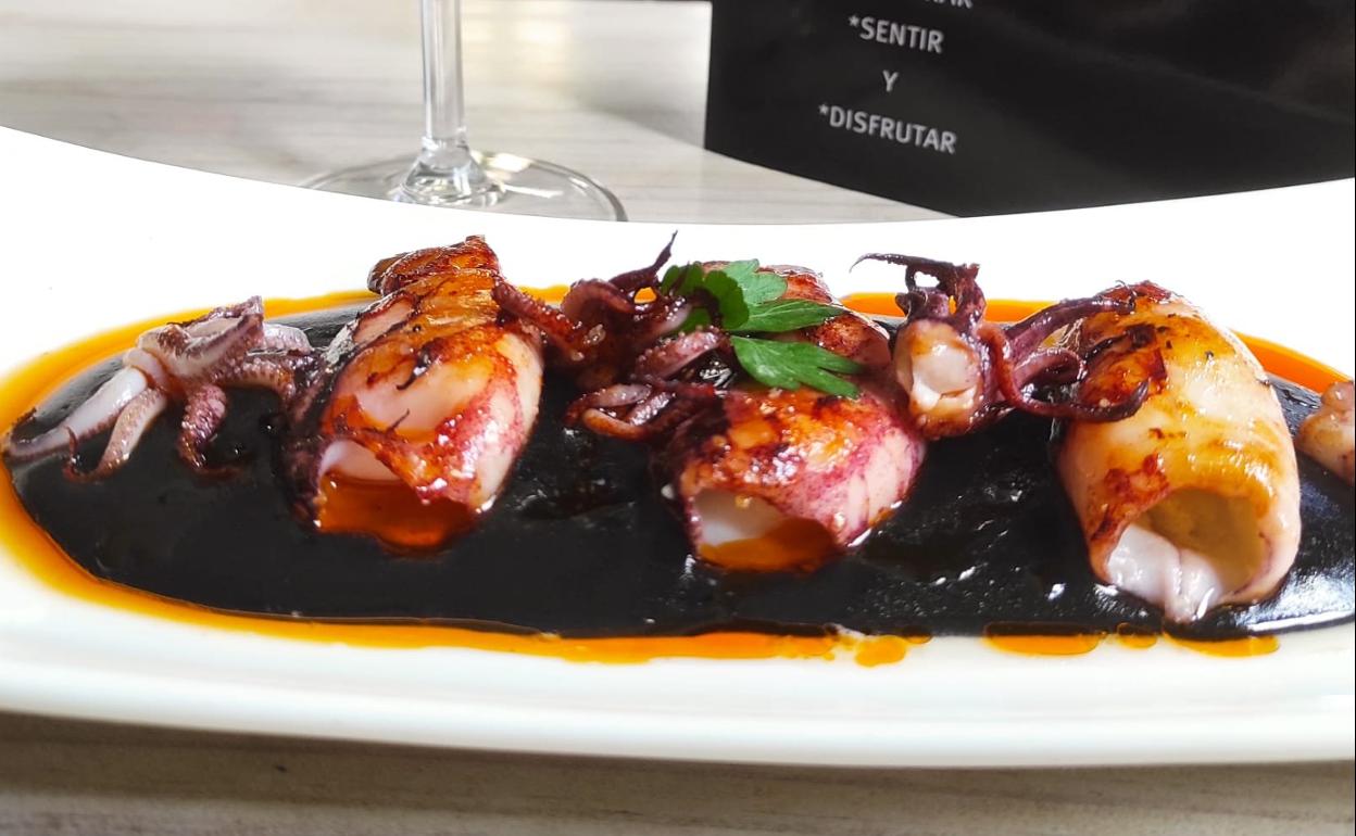 Para finalizar se monta el plato con una base de crema de patata negra. Después, se disponen los chipirones y sus patitas y el toque especial lo aporta el aceite de pimentón, «con pimentón de la Vera y aceite picual», especifica Nati.