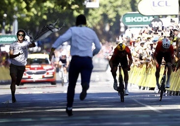 En la ciudad del rugby, donde impera el fervor rojinegro por el Stade Tolousain, no está mal para culminar la etapa un buen placaje por la cintura en la línea de meta cuando Stephene Boury, un exciclista y ahora responsable de las llegadas del Tour, echa a correr desde detrás de la meta y se lanza a por un insensato con un pañuelo palestino en la mano que corre, ¿cómo se metió allí?, paralelo al sprint a dos entre Abrahamsen y Schmid. Lo empotra contra las vallas y evita el caos, aunque da la sensación de que los ciclistas, con visión de túnel bajo las gafas ahumadas, no se dan cuenta ni de la presencia del insensato, ni la del diligente placador, que enseguida es reemplazado por un gendarme que detiene al activista.