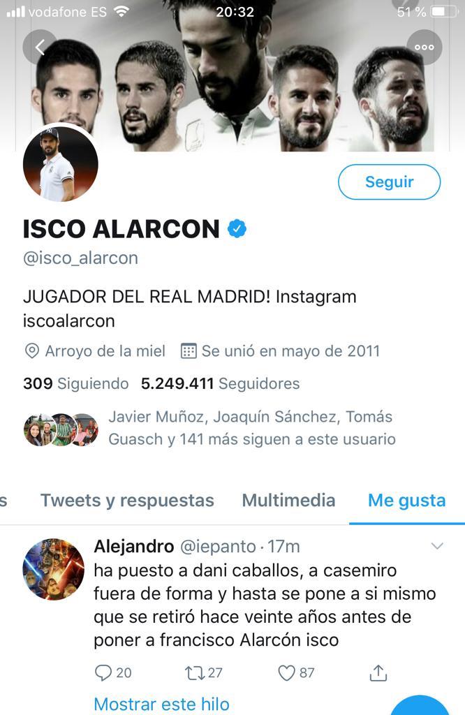 «Ha puesto a Dani Caballos, a Casemiro fuera de forma y hasta se pone a sí mismo que se retiró hace veinte años antes de poner a Francisco Alarcón Isco», fue el mensaje publicado por un aficionado al que el jugador de Arroyo de la Miel y que borró el propio futbolista después del revuelo generado en las redes sociales.