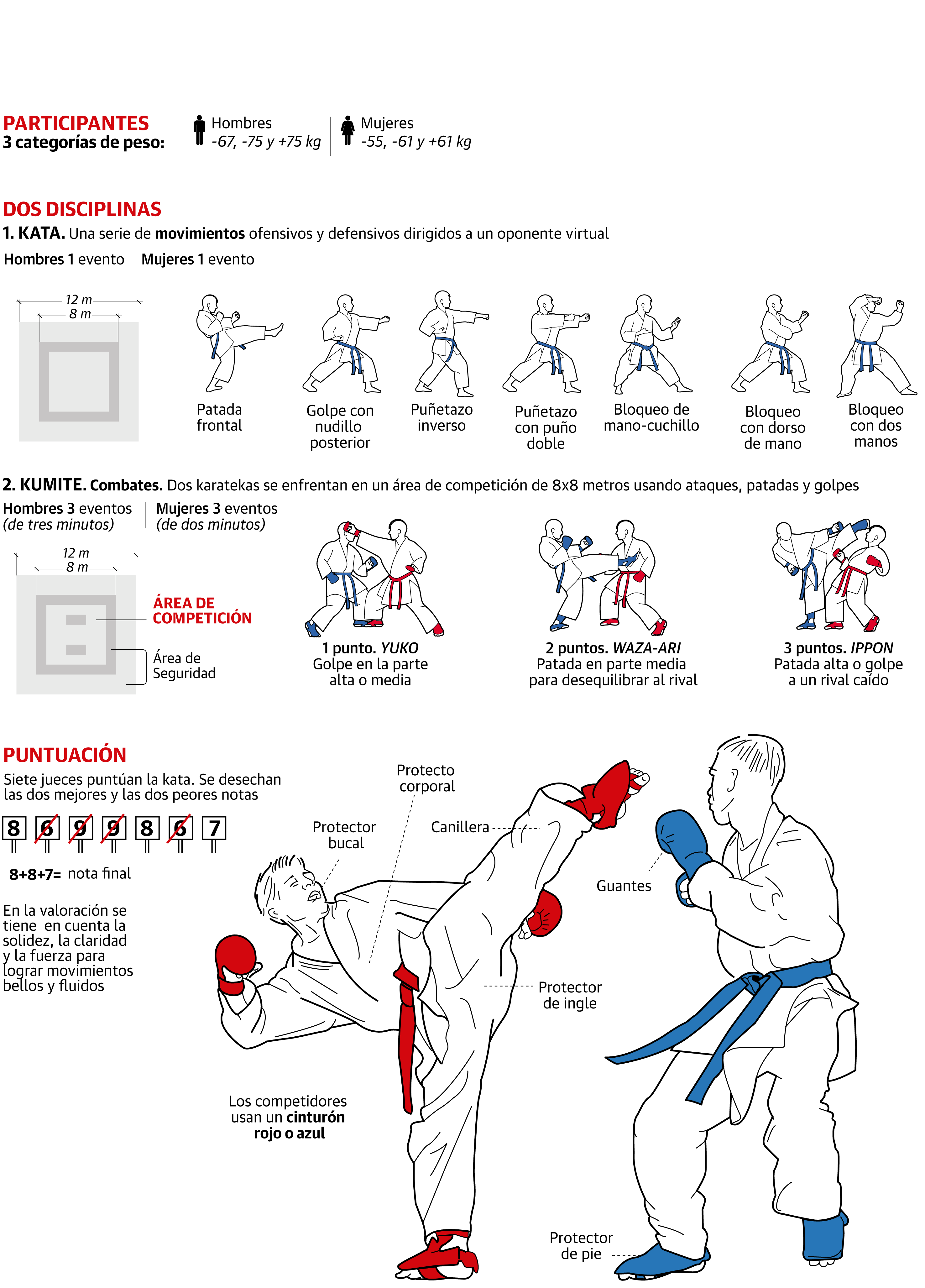 La competición de kárate consta de kata y kumite. Habrá 80 karatecas en total: 60 en las pruebas de kumite y 20 en kata.