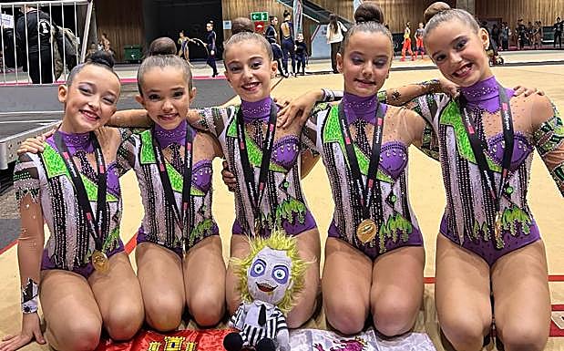 El conjunto alevín del Club Deportiva La Victoria, que se proclamó campeón de España de gimnasia rítmica, presentó sus galones en el centro de Exhibición de Bilbao en una de las citas más esperadas del año. El prestigioso Torneo Euskalgym, preparatorio del Campeonato de España que tendrá lugar en próximas semanas en la localidad de Castellón, disfrutó de una extraordinaria puesta en escena de las vallisoletanas con un ejercicio ambientado en la película de 'Bitelchus' que les concedió por parte del jurado una nota de 18.800 y que a la postre les otorgaría la medalla de oro por delante de equipos contrastados como Pozuelo de Madrid y Areté de Murcia, plata y bronce respectivamente.