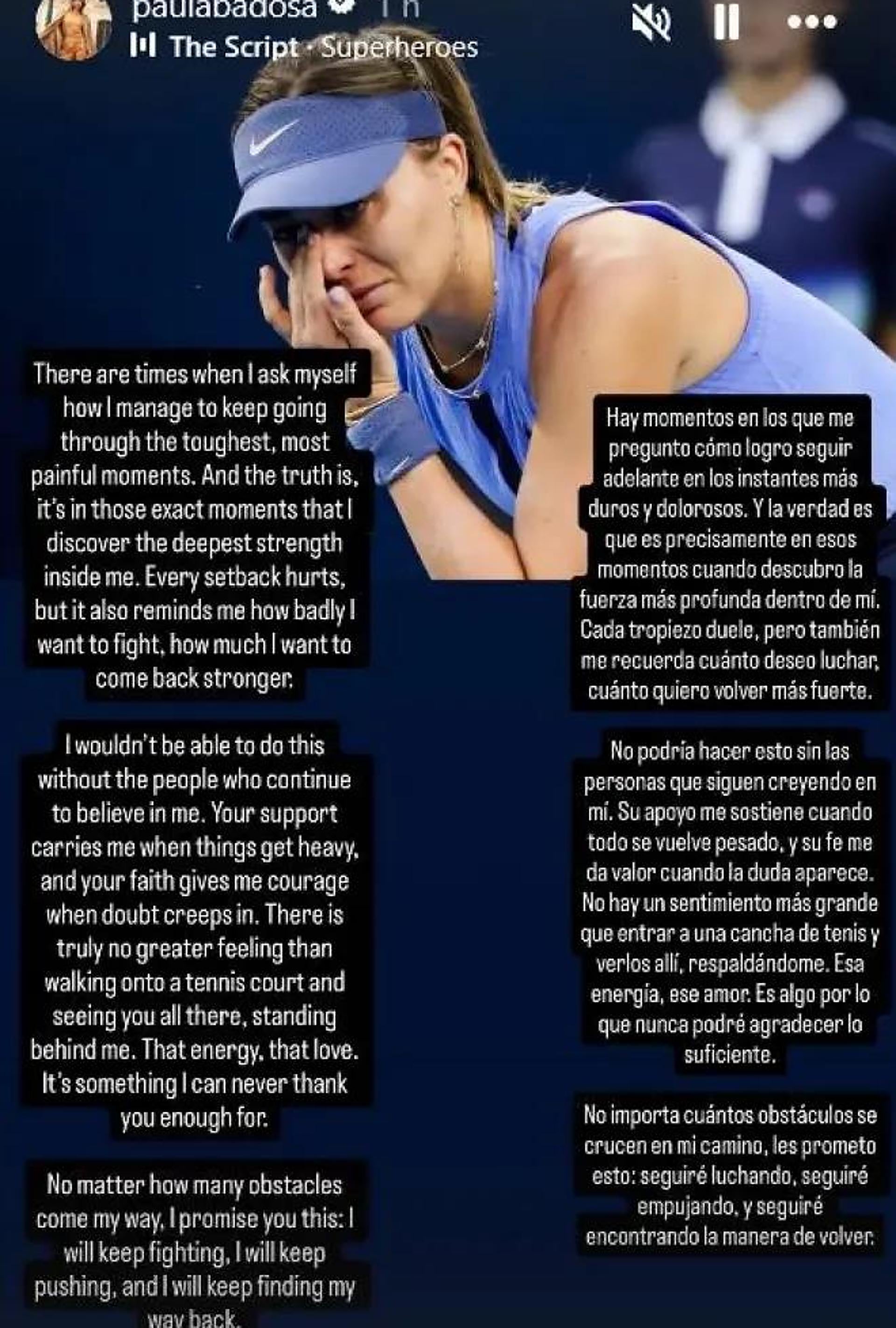 «Hay momentos en los que me pregunto cómo logro seguir adelante en los instantes más duros y dolorosos», escribió Badosa en sus redes sociales. «Y la verdad es que es precisamente en estos momentos cuando descubro la fuerza más profunda dentro de mí. Cada tropiezo duele, pero también me recuerda cuánto deseo luchar, cuánto quiero volver más fuerte».