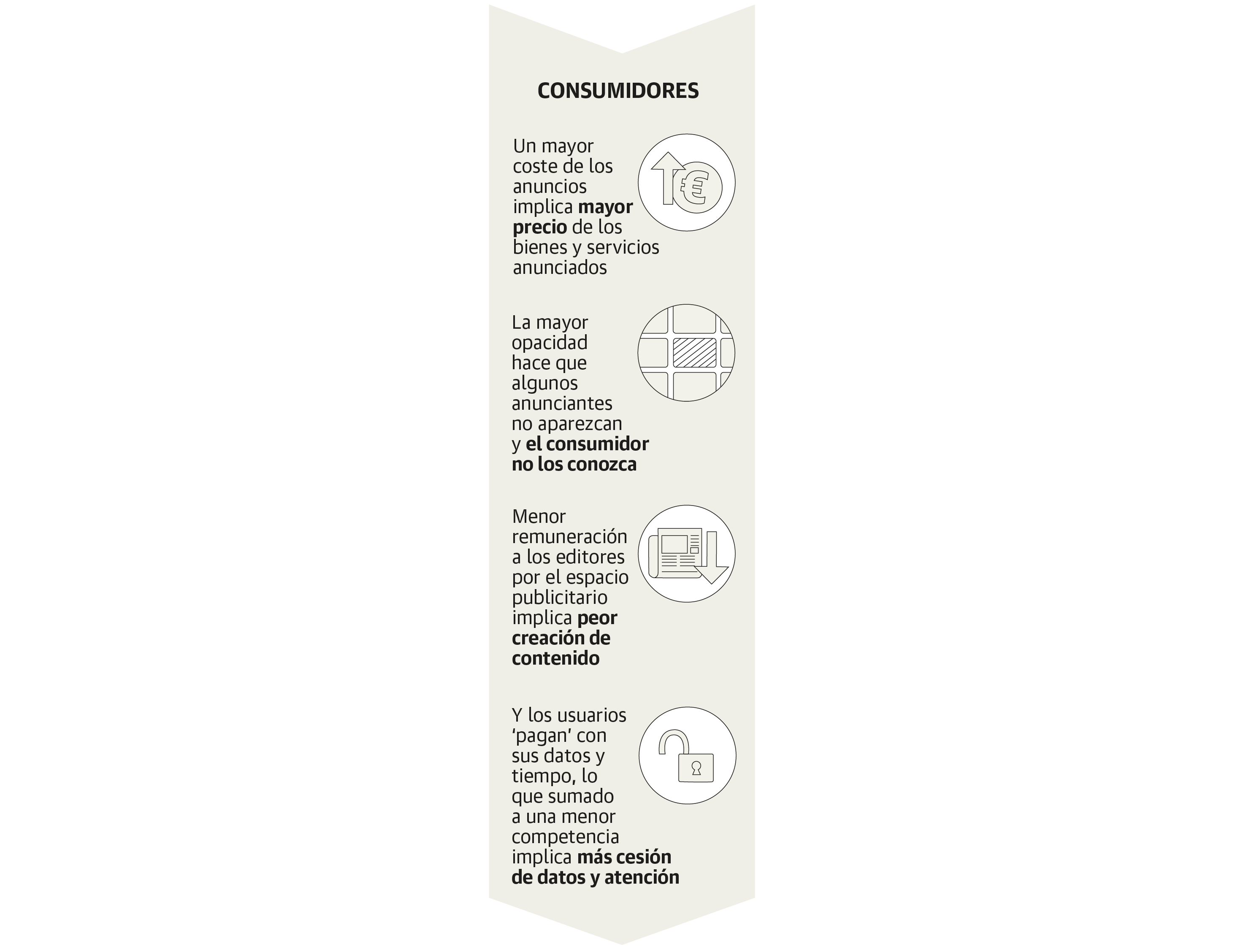 La crudeza de estos datos no deja lugar a dudas ni siquiera para la CNMC, que habla de problemas para la competencia entre las empresas, y de falta de transparencia, para los ciudadanos. No son cuestiones baladíes ni para las corporaciones ni para los millones de usuarios que utilizan diariamente estas plataformas. En el caso de la concentración, porque no tiende a disminuir, «sino todo lo contrario», según Joaquín López, director de Promoción de la Competencia de la CNMC. La ausencia de un proceso transparente refuerza el poder de estas plataformas e intermediarios que cuentan con más información que los compradores de publicidad.