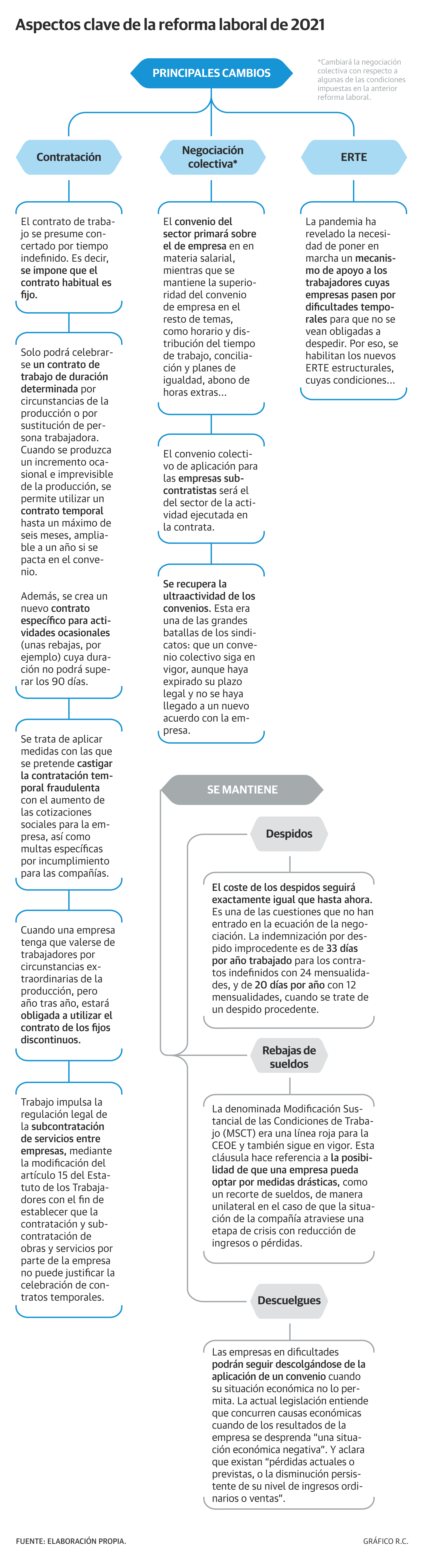 La nueva reforma laboral que entrará en vigor en 2022 mantiene gran parte de los mecanismos de flexibilidad interna que aportó la de 2012 –una línea roja para la CEOE–, pero recupera también derechos perdidos de los trabajadores al reequilibrar la negociación colectiva, limitar la subcontratación y poner coto a los contratos temporales. «España es hoy mucho mejor con esta norma», dijo con satisfacción la ministra de Trabajo, Yolanda Díaz, que resaltó que «hoy es un día histórico para los trabajadores».