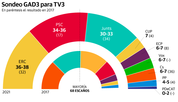 Otro sondeo, el del Periódico de Cataluña, estrecha aún más las diferencias y presume un triple empate entre PSC, ERC y JxCat con Vox como cuarta fuerza del Parlament. Según esta encuesta, los socialistas (22,7%) podrían ganar las elecciones en votos, pero se disputa la victoria con ERC (20,4%) y Junts per Catalunya (20% de los escrutinios). La cuarta fuerza sería Vox con 10-11 y el 7,5% de las papeletas. Luego estaría en Comú Podem con 8-9, Ciudadanos se hundiría y perdería 30 de los 36 escaños que le dieron la victoria en los anteriores comicios. El PP obtendría 6-7 representantes.
