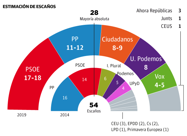 El Partido Socialista ganaría las elecciones europeas del próximo 26 de mayo con 17 o 18 diputados, el Partido Popular resistiría en la segunda posición, con once o doce escaños, y Ciudadanos no lograría el 'sorpasso' y tendrá que conformarse con ocho o nueve europarlamentarios, según el Barómetro Preelectoral de Abril del Centro de Investigaciones Sociológicas (CIS). En la actualidad, los populares son el partido con más representantes, 16; los socialistas tienen 14; Unidas Podemos, cinco; y Ciudadanos, dos.