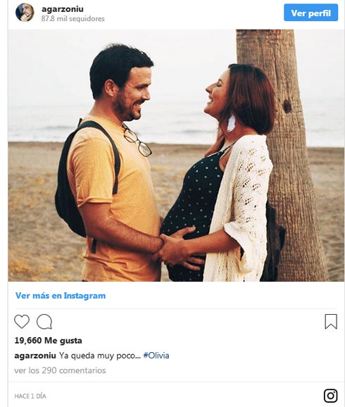 La última de las publicaciones revela el sexo y nombre de su retoño. En la imagen que ha subido a Instagram se puede ver a la pareja con una actitud muy cariñosa, acompañada del mensaje: «Ya queda muy poco...», junto al «hashtag» Olivia, el nombre del bebé.
