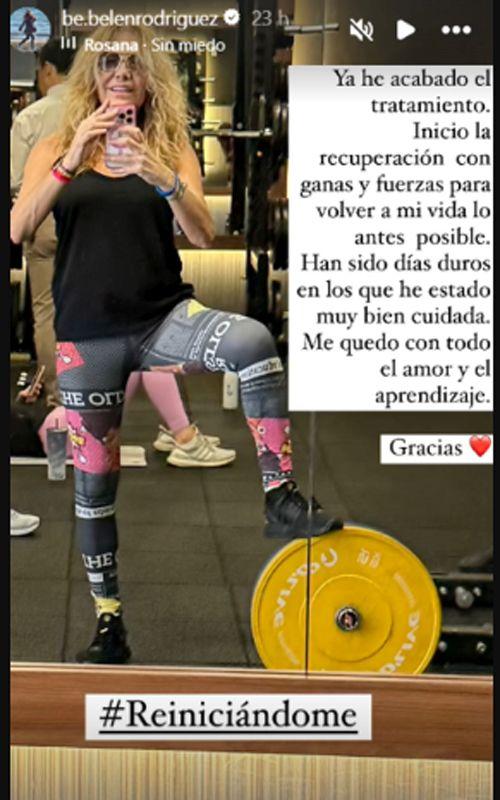 Belén Rodríguez ha compartido un mensaje con sus seguidores: «Ya he acabado el tratamiento», empezó. «Inicio la recuperación con ganas y fuerzas para hacer mi vida lo antes posible», continuó en una historia de Instagram.