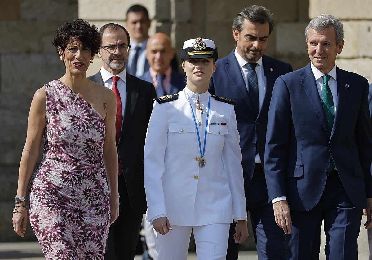 Vestida con su uniforme de gala como guardamarina de primero, la princesa de Asturias salía puntual del hotel Reyes Católicos y recorría andando la distancia hasta el pazo do Raxoi, sede del Gobierno autonómico. Allí la esperaban el presidente de la Xunta, Alfonso Rueda, y la ministra Elma Saiz, con ausencia de la alcaldesa del BNG, Goretti Sanmartín. Los nacionalistas se han mostrado contrarios a la concesión de la Medalla. Un honor, en palabras de Rueda, que ya recibió su abuelo Juan Carlos I en 1985 y que representa «el cariño, la adhesión y la lealtad sincera de la gente de Galicia a su persona y a la Corona».