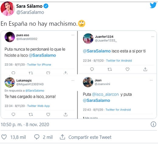 Esta no es la primera vez que Sálamo se queja de esta situación. En noviembre del año pasado escribió un contundente mensaje en su perfil de Twitter. «¿En España no hay machismo?», se preguntó de manera retórica, acompañando el mensaje con un puñado de capturas de insultos machistas recibidos tras un partido en el que el Real Madrid perdió contra el Valencia por goleada. «Te has cargado a Isco, zorra» o «Puta, nunca te perdonaré lo que le hiciste a Isco» son algunos de los insultos que recibió la actriz.