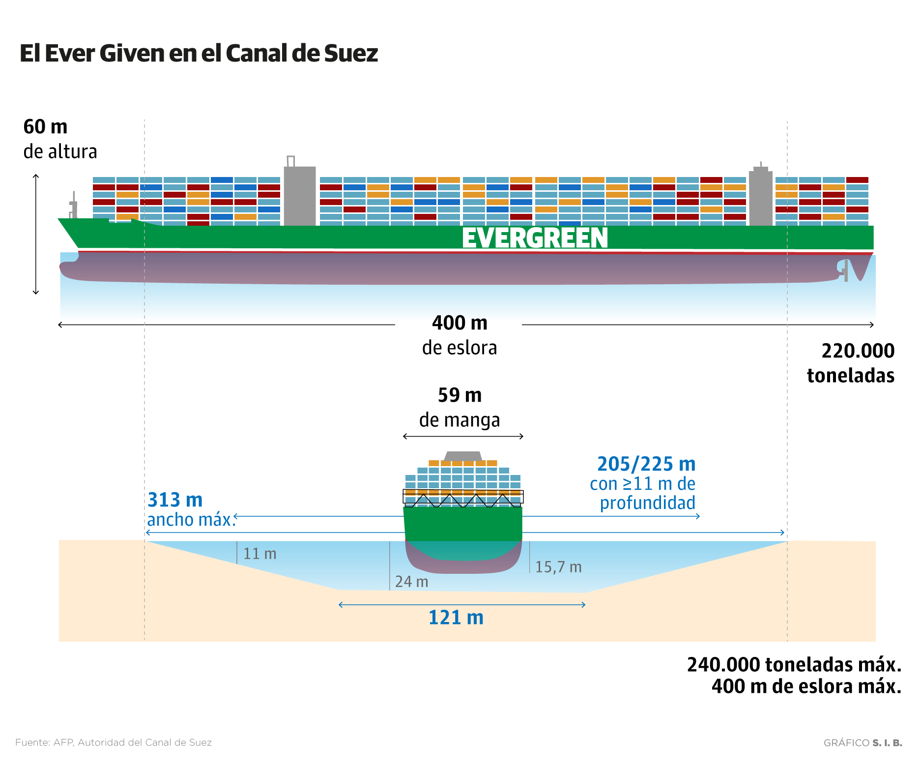 Parecía que quedaban ya solo 24 horas para que el navío pudiera ser liberado, pero el gigante se tomó el domingo como jornada de descanso y ya no se desplazó ni un centímetro más. Todo apunta a que el portacontenedores, de bandera panameña pero propiedad de una compañía japonesa, deberá ser vaciado para poder mover sus 220.000 toneladas de peso, 400 de eslora y 60 de manga.