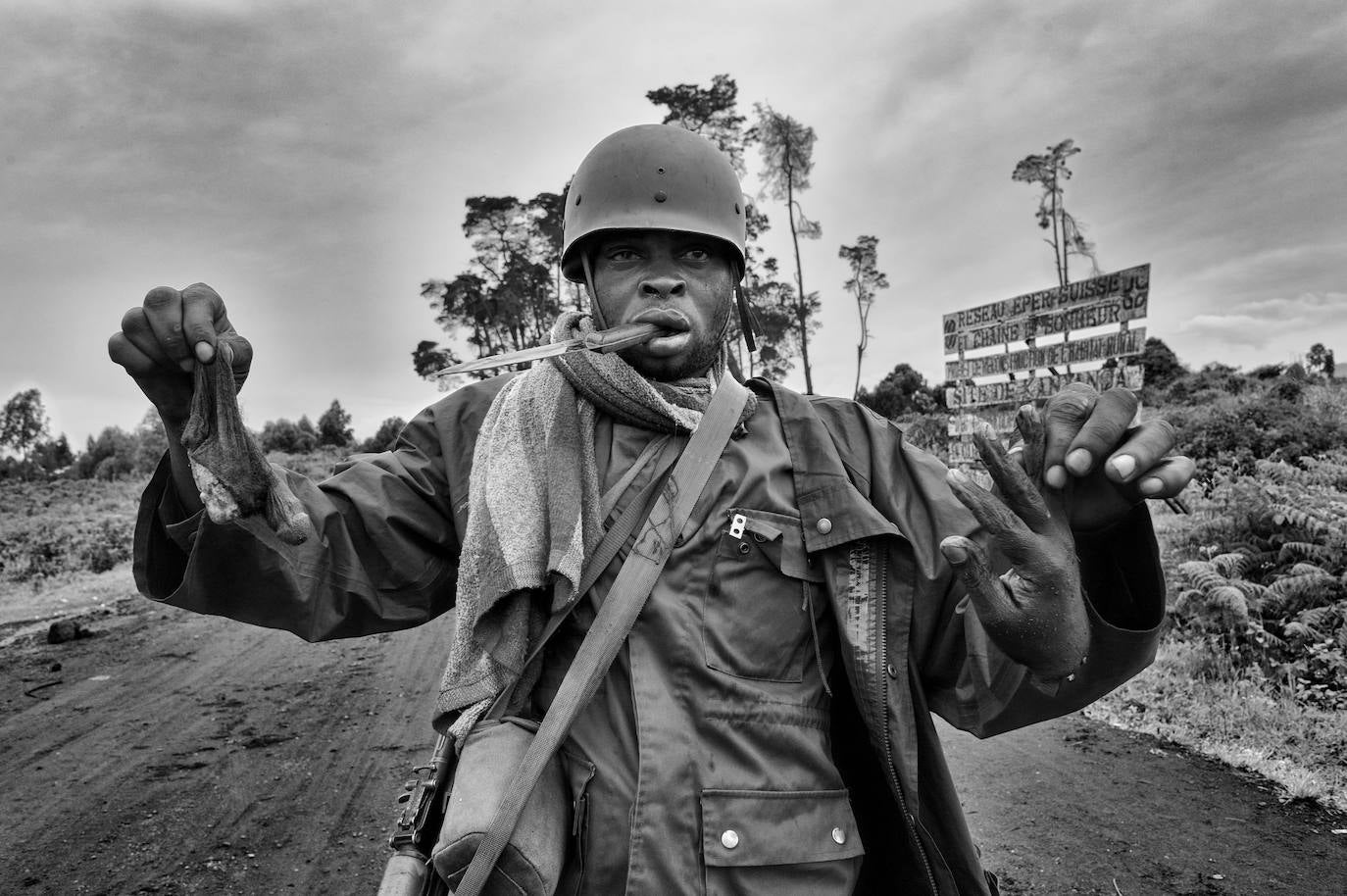 Un soldado del FRDC (ejército congoleño) lleva en su mano los órganos sexuales y la mano, amputados con su cuchillo, de un soldado del CNPD (Congreso Nacional para la Defensa del Pueblo).
