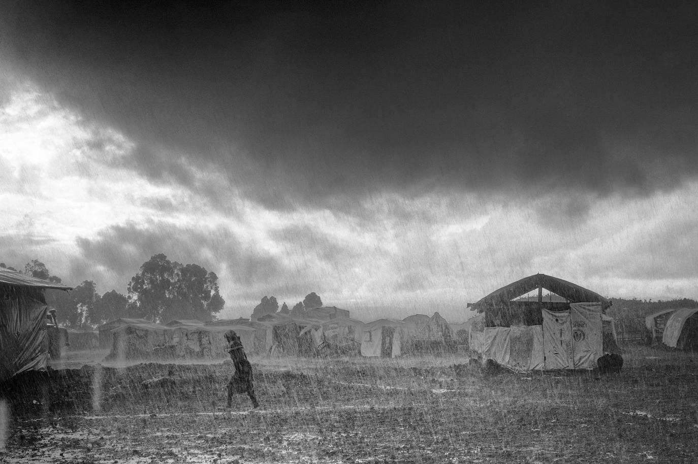 Una mujer desplazada por los combates de la República del Congo camina bajo la lluvia en el interior de un campo de refugiados.