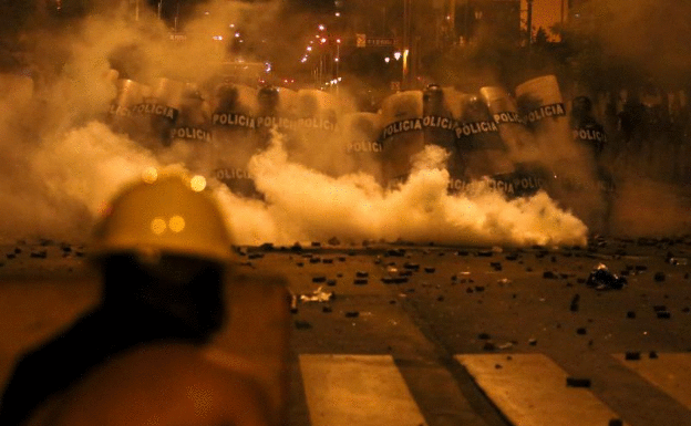 La crisis política y social se agudiza en Perú. El arresto y posterior destitución, hace ya mes y medio, del expresidente Pedro Castillo a causa del fallido autogolpe de Estado ha derivado en múltiples protestas durante las últimas semanas. Ayer, la denominada 'toma de Lima', en la que miles de personas salieron a las calles de la capital para pedir la renuncia de la mandataria, Dina Boluarte, elevó la tensión. La jornada derivó en una batalla campal entre los manifestantes y las fuerzas de seguridad en diversos puntos de la ciudad, con la quema de mobiliario urbano, el cierre de parte del transporte público y el lanzamiento por parte de la Policía de gases lacrimógenos en un esfuerzo por apaciguar los disturbios.