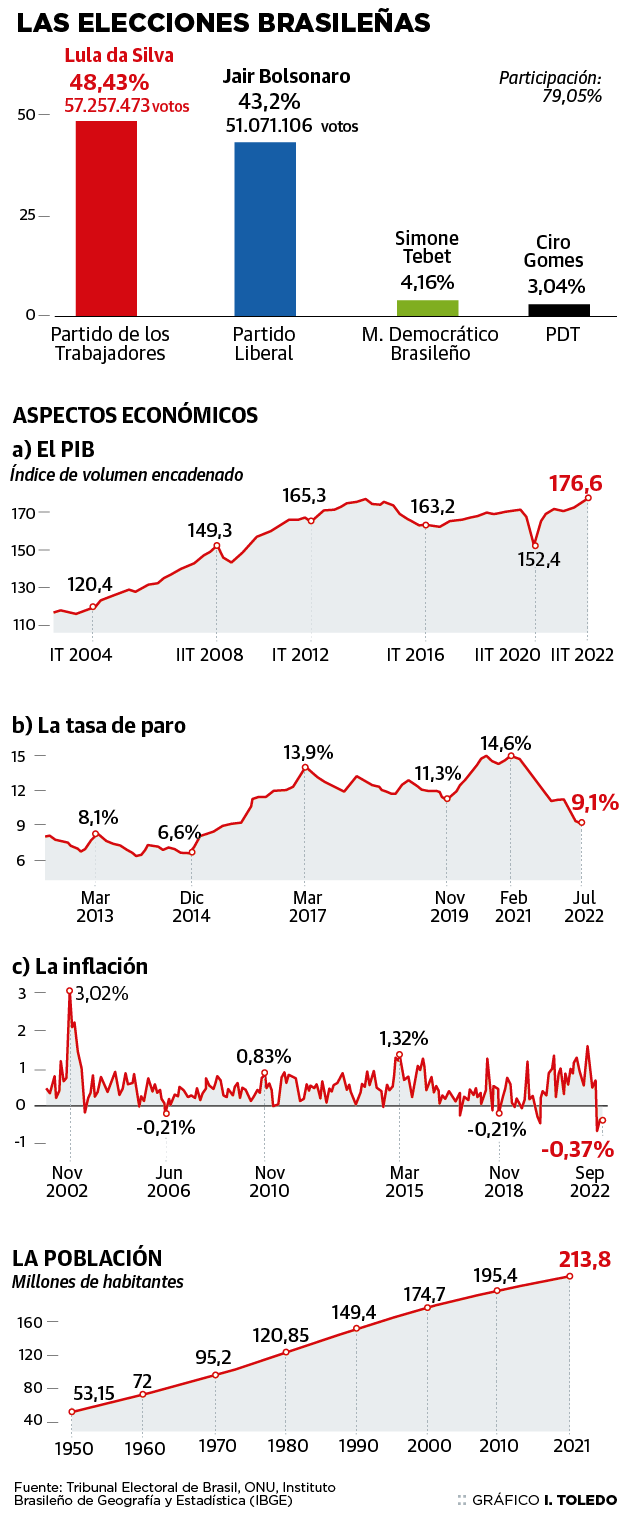 Lula da Silva (76 años), el hombre que se alojó en el Palacio de Planalto entre 2003 y 2010, era el gran favorito para la prensa y las empresas demoscópicas. Se impuso por más de seis millones de votos, pero no obtuvo la mayoría que esperaba. Su rival, el actual mandatario Jair Bolsonaro (67 años), se vino arriba cuando casi todos daban por finalizado su tiempo. El líder de la derecha brasileña sobrevivió a los pronósticos y, por tanto, tendrá una segunda oportunidad. El bolsonarismo no se rinde. Ha ganado tiempo para volver a cargar las armas hasta que las urnas electrónicas vuelvan a abrirse. Será un tiempo extra duro, violento, incluso con mayor crudeza que la que se ha mostrado durante la campaña electoral en la primera vuelta. Pero a los brasileños parece que les gusta el morbo.
