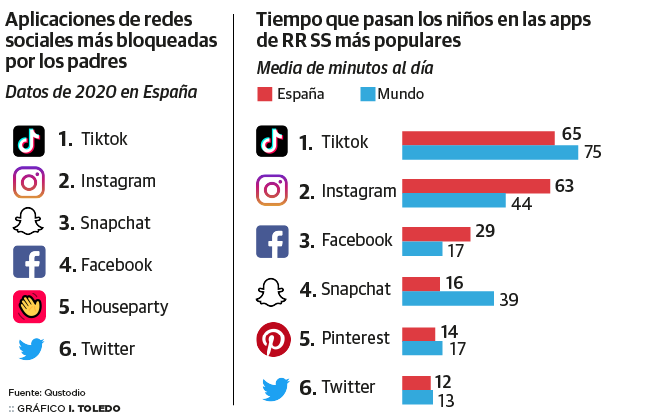 TikTok es la red a la que sus usuarios pasan más tiempo conectados. 75 minutos al día de media global según Qustodio, 31 minutos más que la segunda clasificada, Instagram. En España, la diferencia es menor: 65 minutos frente a 63 de la red social de Zuckerberg. Pero la progresión es espectacular: en solo un año, el tiempo que pasan en la aplicación se ha duplicado. «Y le queda mucho recorrido», predice Martínez.