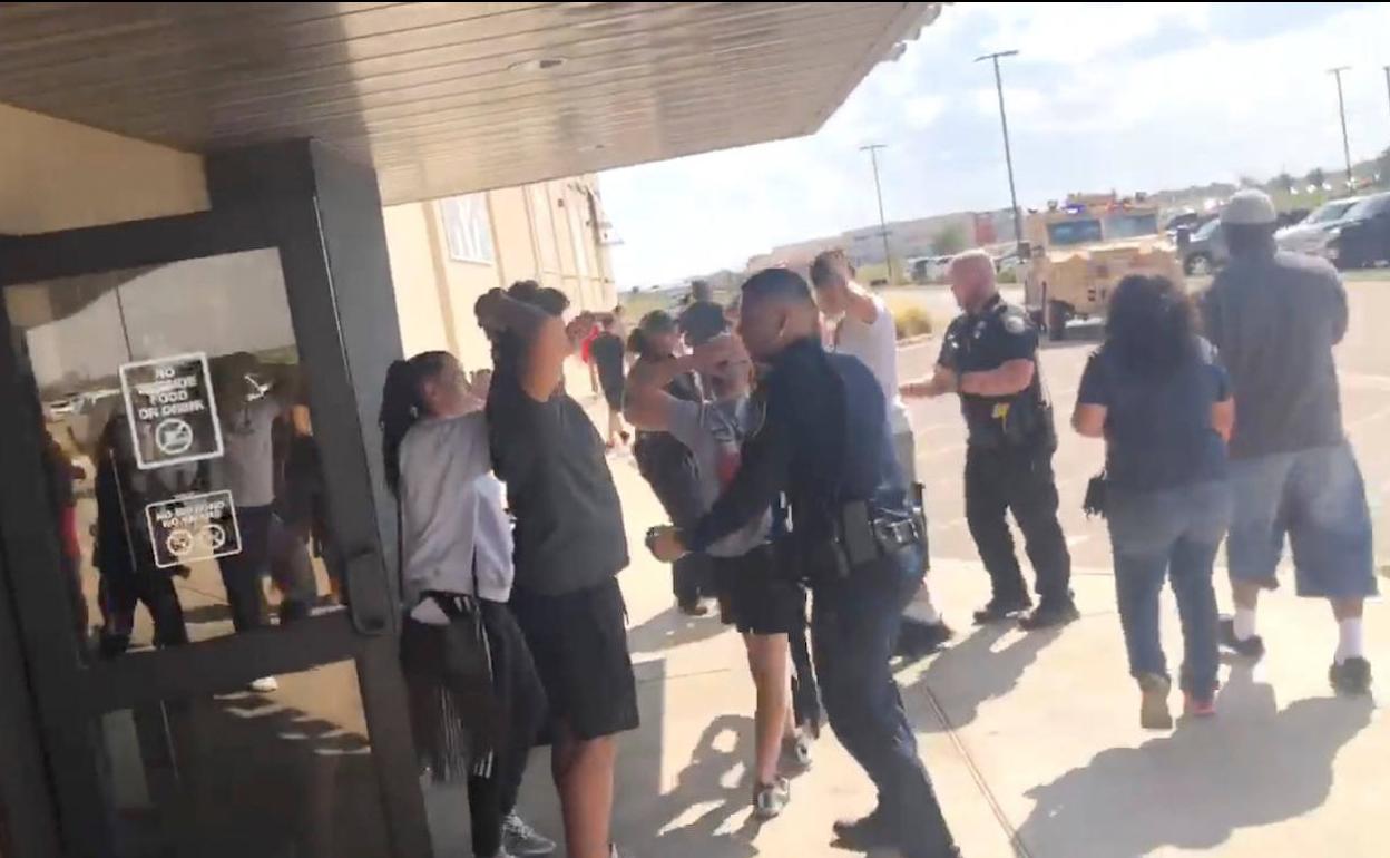 Un grupo de personas es evacuado tras el tiroteo en los cines Cinergy Odessa, en Texas. Reuters